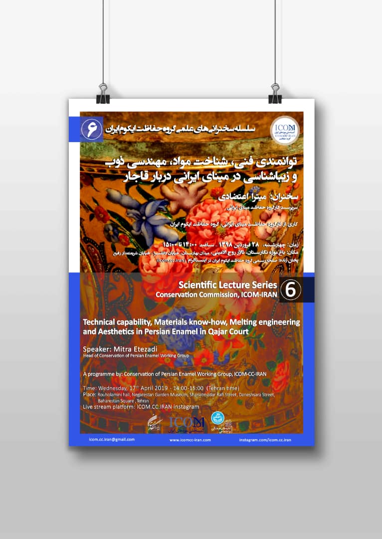 06 فروردین توانمندی فنی، شناخت مواد، مهندسی ذوب و زیباشناسی در مبنای ایرانی دربار قاجار توانمندی فنی، شناخت مواد، مهندسی ذوب و زیباشناسی در مبنای ایرانی دربار قاجار by دکتر میترا اعتضادی 363 ۳۶۳ people viewed this event. Register for event To register for this event email your details to authority@aaasc.com Register using webmail: Gmail / AOL / Yahoo / Outlook Date And Time ۱۳۹۸-۰۱-۲۸ @ ۰۲:۰۰ بعد از ظهر to ۱۳۹۸-۰۱-۲۸ @ ۰۳:۰۰ بعد از ظهر Location باغ موزه نگارستان ـ تالار روح الامینی Event Types Conference Event Category Science & Technology Share With Friends Facebook Twitter Linkedin Xing Pinterest Related Events شبهای تهران – گنجینه هزار و یکشب, مروری بر داستان جواهرات ملی ۱۳۹۷-۰۴-۰۳ خانه موزه شهید مدرس Conference کارگاه ساختار شناسی آثار لاکی شرق دور (اوروشی) ۱۳۹۸-۱۰-۲۶ خیابان ولیعصر روبروی بزرگراه هاشمی رفسنجانی بلوار اسفندیار شماره ۳۵ - تهران Conference آسیب شناسی آرایه ها در بافته های درباری قاجار در روند درمان و مرمت ۱۳۹۸-۰۷-۱۶ خیابان آزادی تقاطع بزرگراه یادگار امام Conference گونه شناسی روشهای حفاظت و مرمت و شیوه های برخورد با مواد متفاوت در آثار فرهنگی – هنری ۱۴۰۰-۰۲-۱۳ Online Event Seminar or Talk دکتر میترا اعتضادی کارگاه ساختار شناسی آثار لاکی شرق دور (اوروشی) شبهای تهران – گنجینه هزار و یکشب, مروری بر داستان جواهرات ملی